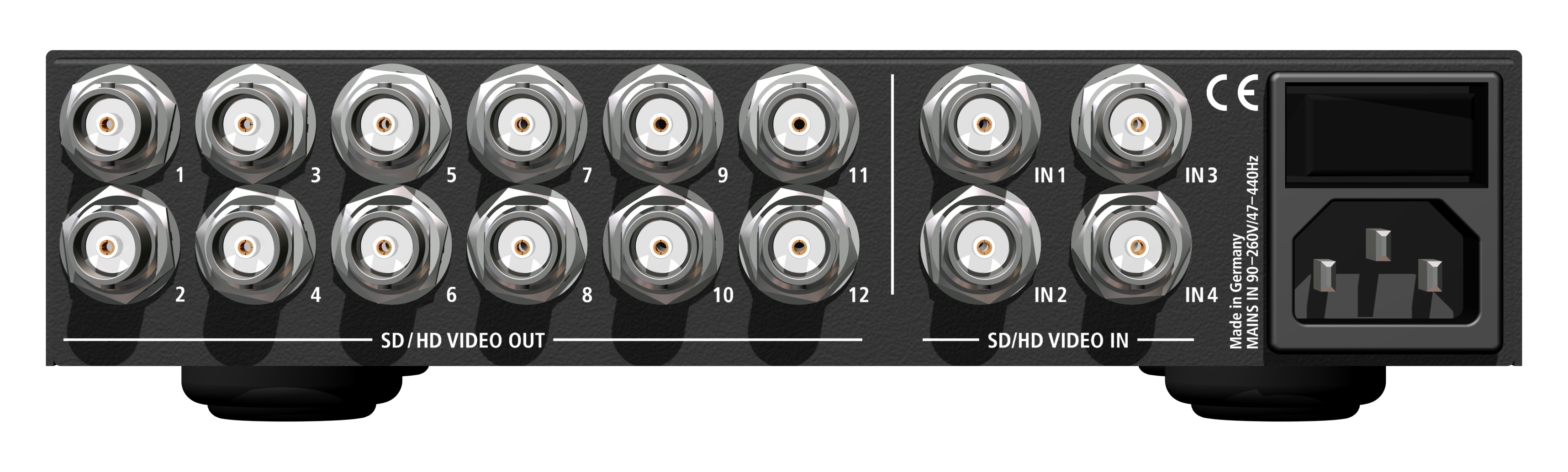 Due to its free assignable routing principle, the MC5 is useable in a wide range of video applications. One input reference signal can be distributed to one, but also on up to 12 outputs. When inputing more signals the available number of outputs will be reduced accordingly. But due to the routing capabilities of MC5, the number of the outputs for the individual input signals can be assigned free. Additionally, the unit offers a preset management which allows to store and to switch over 4 different settings of all outputs. So, MC5 enables to configure the exact needed number of outputs for every video distribution application very easily.